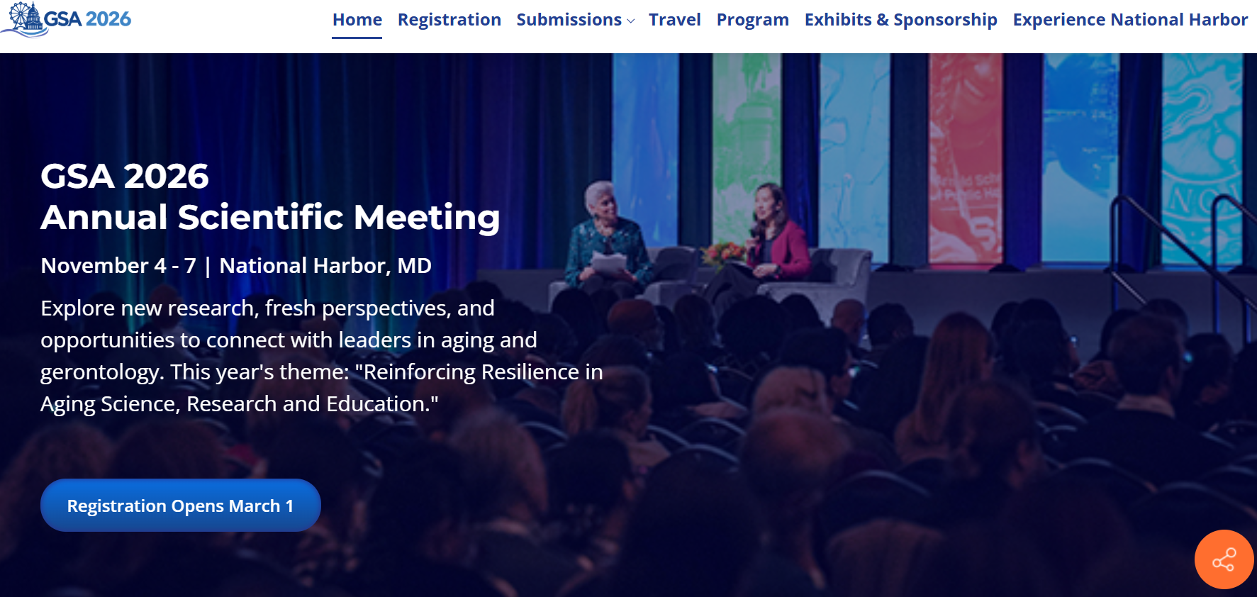 Join global leaders in aging and gerontology at the GSA 2026 Annual Scientific Meeting to explore cutting-edge research, connect with peers, and advance resilience in aging science. Don’t miss this opportunity to collaborate, share insights, and shape the future of healthy aging at one of the field’s premier events. Registration opens March 1.